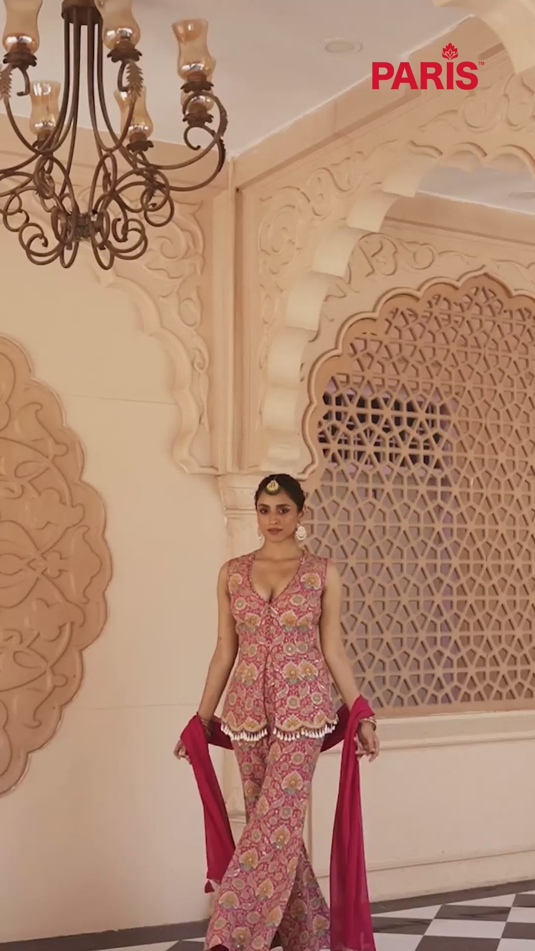 This vibrant magenta Indo-western palazzo set is crafted in rich silk fabric and showcases multicolor print work enhanced with pearl, cut dana, zari, and sequin embellishments. The sleeveless peplum-style top features a V-neckline and playful shell tassel detailing at the hem. Paired with matching wide-leg bottoms and a dupatta, it€™s perfect for festive and fusion occasions.
